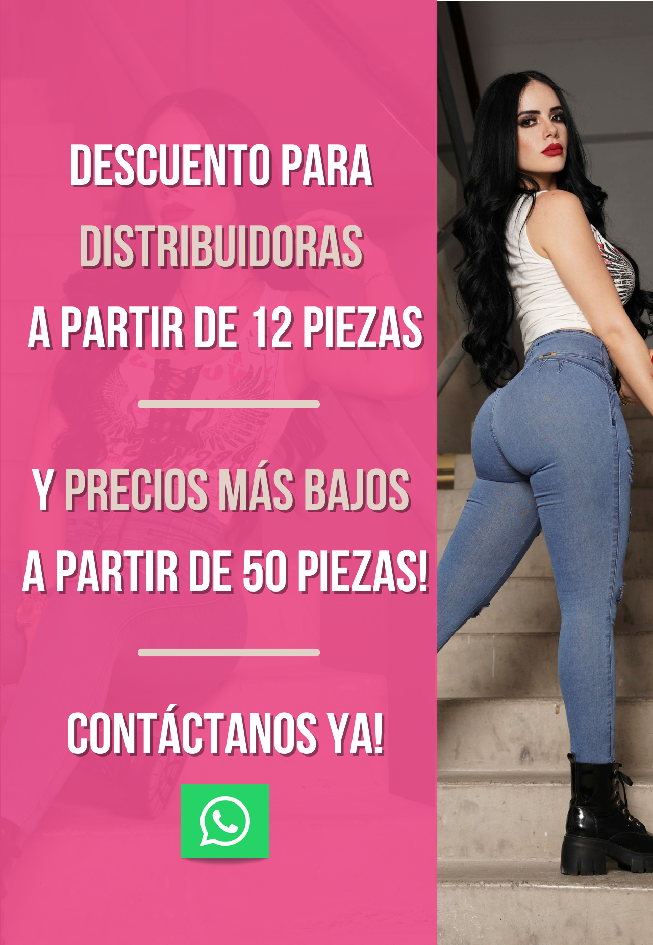 Aprovecha nuestros precios especiales al realizar una compra de 12 a 50 piezas, eligiendo entre una variedad de modelos y con un mÃnimo de 5 tallas. Contáctanos por WhatsApp para recibir una atención personalizada y resolver cualquier duda que tengas.